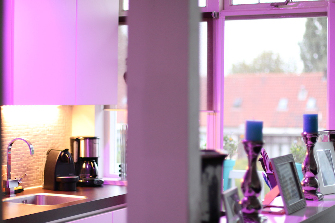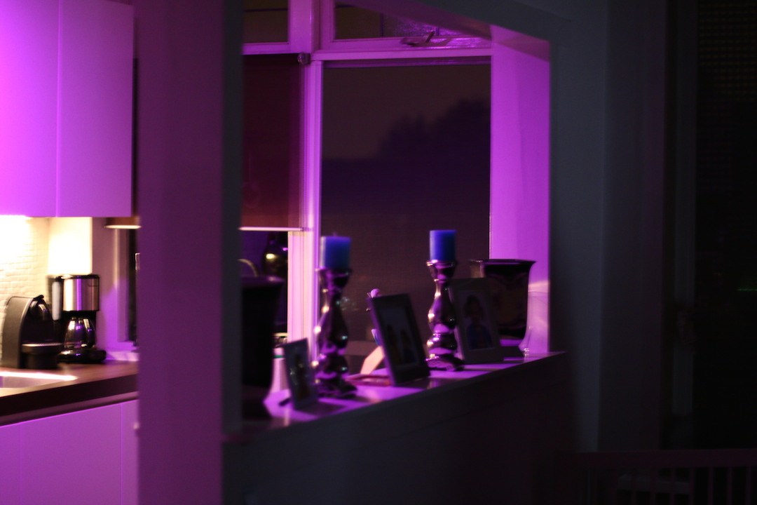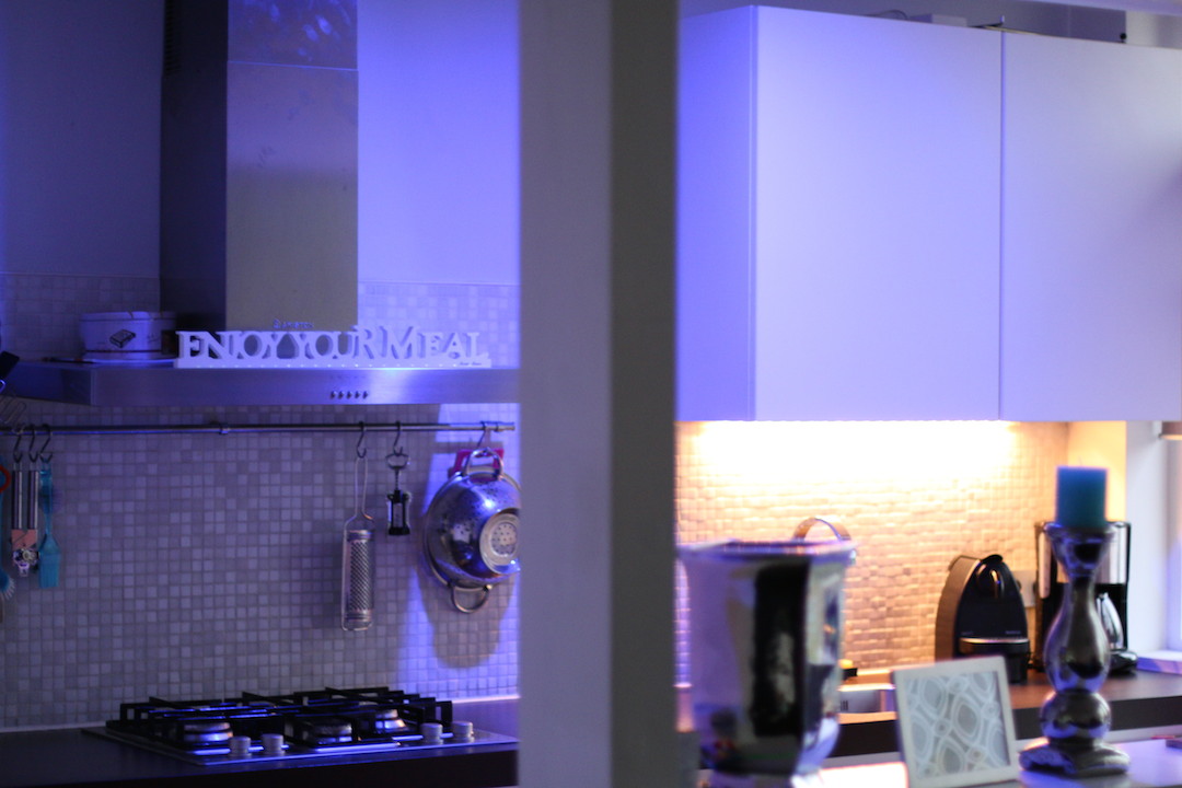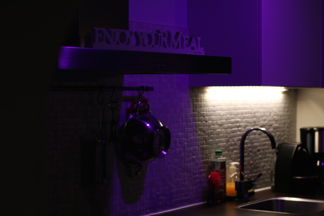 Net zo belangrijk als bediening natuurlijk. Nou ben ik geen licht-expert, maar wel een consument, daarom benader ik ook op die manier. Overdag heb je weinig aan het licht, want dan zal het jouw kamer niet kleuren, maar dat lijkt mij vrij logisch. Zodra het schermig wordt, zou je het licht wel al kunnen gebruiken. Hieronder zie je een reeks foto’s die ik heb genomen rond 16:30 uur op een wat regenachtige dag. Ik heb hier 1 spot gebruikt voor het verlichten van mijn keuken. 1 LED spot in het midden van de keuken was ruim voldoende licht voor de gehele keuken. Ik vond het rond dat tijdstip al een cool effect hebben voor mijn gehele woonkamer. Ik heb immers een openkeuken met een bar, waardoor het licht door de gehele woonkamer te zien was. Simpel gezegd het geeft sfeer.