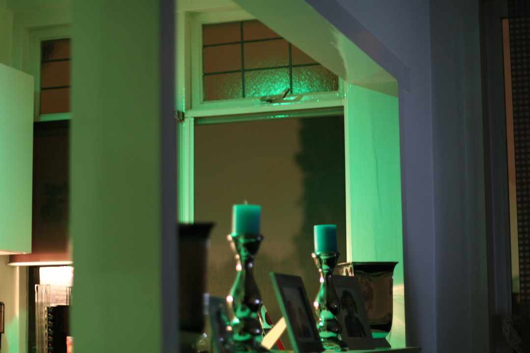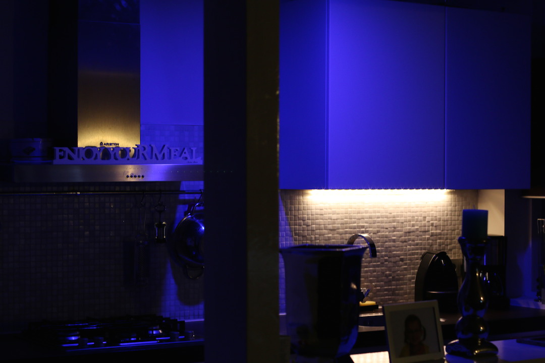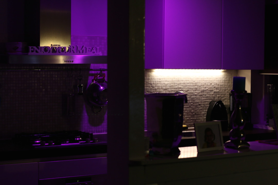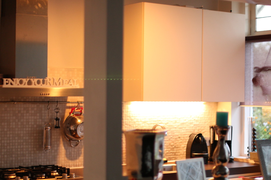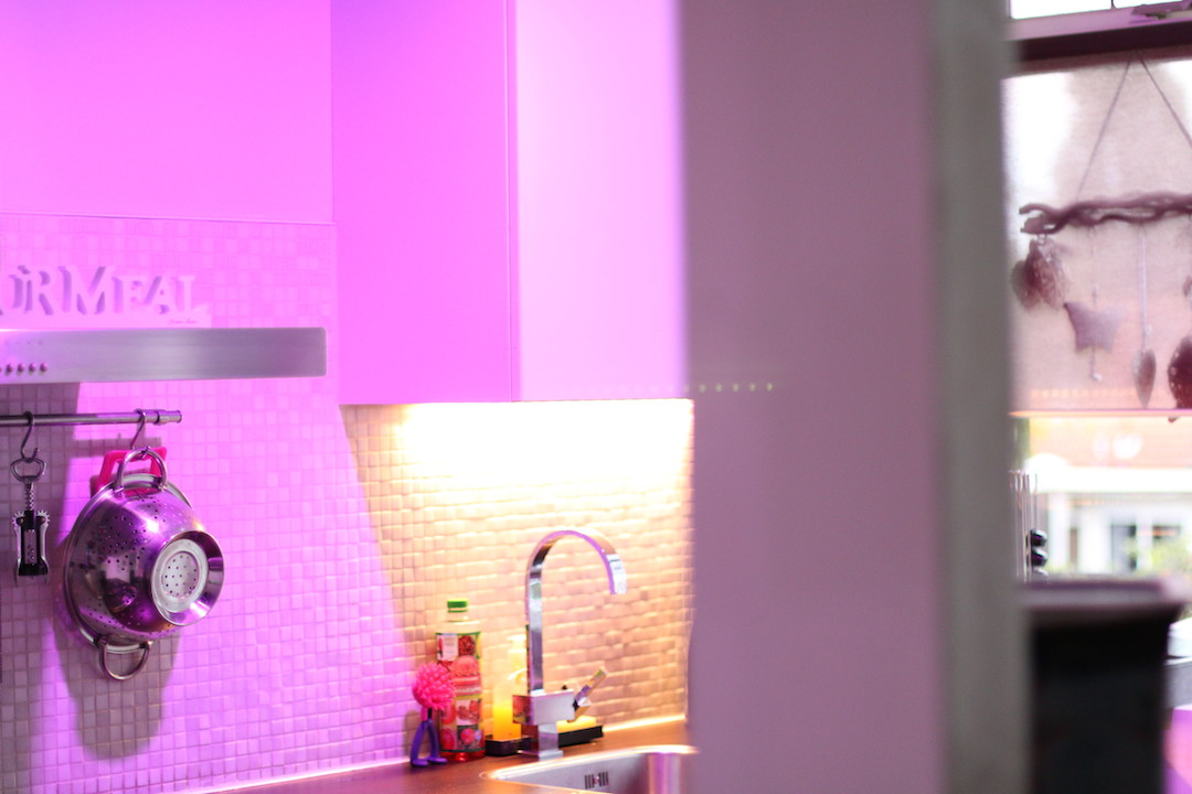Net zo belangrijk als bediening natuurlijk. Nou ben ik geen licht-expert, maar wel een consument, daarom benader ik ook op die manier. Overdag heb je weinig aan het licht, want dan zal het jouw kamer niet kleuren, maar dat lijkt mij vrij logisch. Zodra het schermig wordt, zou je het licht wel al kunnen gebruiken. Hieronder zie je een reeks foto’s die ik heb genomen rond 16:30 uur op een wat regenachtige dag. Ik heb hier 1 spot gebruikt voor het verlichten van mijn keuken. 1 LED spot in het midden van de keuken was ruim voldoende licht voor de gehele keuken. Ik vond het rond dat tijdstip al een cool effect hebben voor mijn gehele woonkamer. Ik heb immers een openkeuken met een bar, waardoor het licht door de gehele woonkamer te zien was. Simpel gezegd het geeft sfeer.