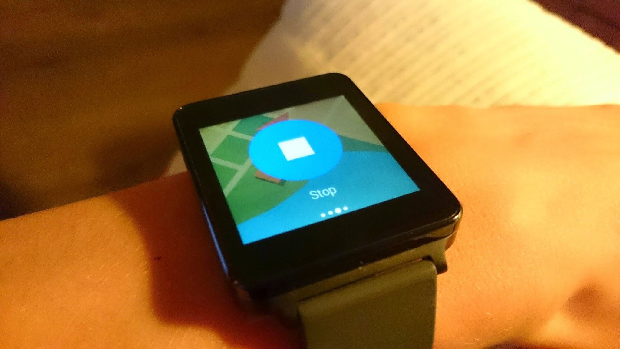 My Tracks staat nu in het rijtje met applicaties op mijn Android Wear smartwatch (LG G Watch, om precies te zijn) en laat een grote rode knop als startscherm zien. Druk je op deze knop dan begint de app met het vastleggen van jouw route. Zorg er wel voor dat locatievoorziening (GPS, hoogste nauwkeurigheid) op je telefoon ingeschakeld is, anders tikt de tijd vrolijk verder maar blijft het aantal meter op nul staan. Door te swipen op het scherm van je horloge ga je naar andere schermen, dit werkt zonder problemen. De Android Wear app biedt je de mogelijkheid om de route te pauzeren, stop te zetten of de app te ‘muten’. Op het 1:10 tijdscherm zie je dat de app aan het opnemen is en het aantal meter op nul staat. Op het 1:15 tijdscherm heb ik de app gepauzeerd, dat werkt dus ook goed.