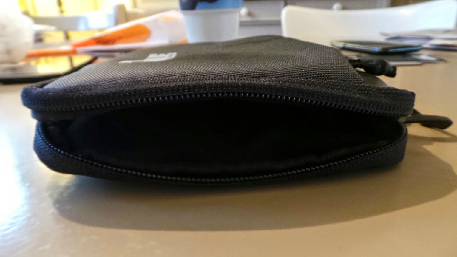De afmetingen van de binnenkant van de hoes zijn 15,5 bij 22,1 bij 1,5 centimeter. De iPad Mini Retina past er dus precies is, maar ook veel 7” tablets zul je zonder problemen in de case kunnen stoppen. Ik heb – zoals eerder gezegd – de case getest met de 8” Sony Xperia Z3 Tablet Compact, die voor het mooie iets te groot is. De hoes is gemaakt van nylon en voelt als een Eastpack rugzak, prima dus. Op de bovenzijde vinden we de merknaam Thule, verder is de hoes vrij van tierelantijnen. Overigens reflecteert het logo, wel zo handig in het donker. De binnenzijde is bedekt met velours, wat ervoor moet zorgen dat je tablet krasvrij blijft. De zijkanten beschikken over een foamvoering, voor extra stevigheid. De case weegt 110 gram en zal je tas dus niet echt verzwaren.