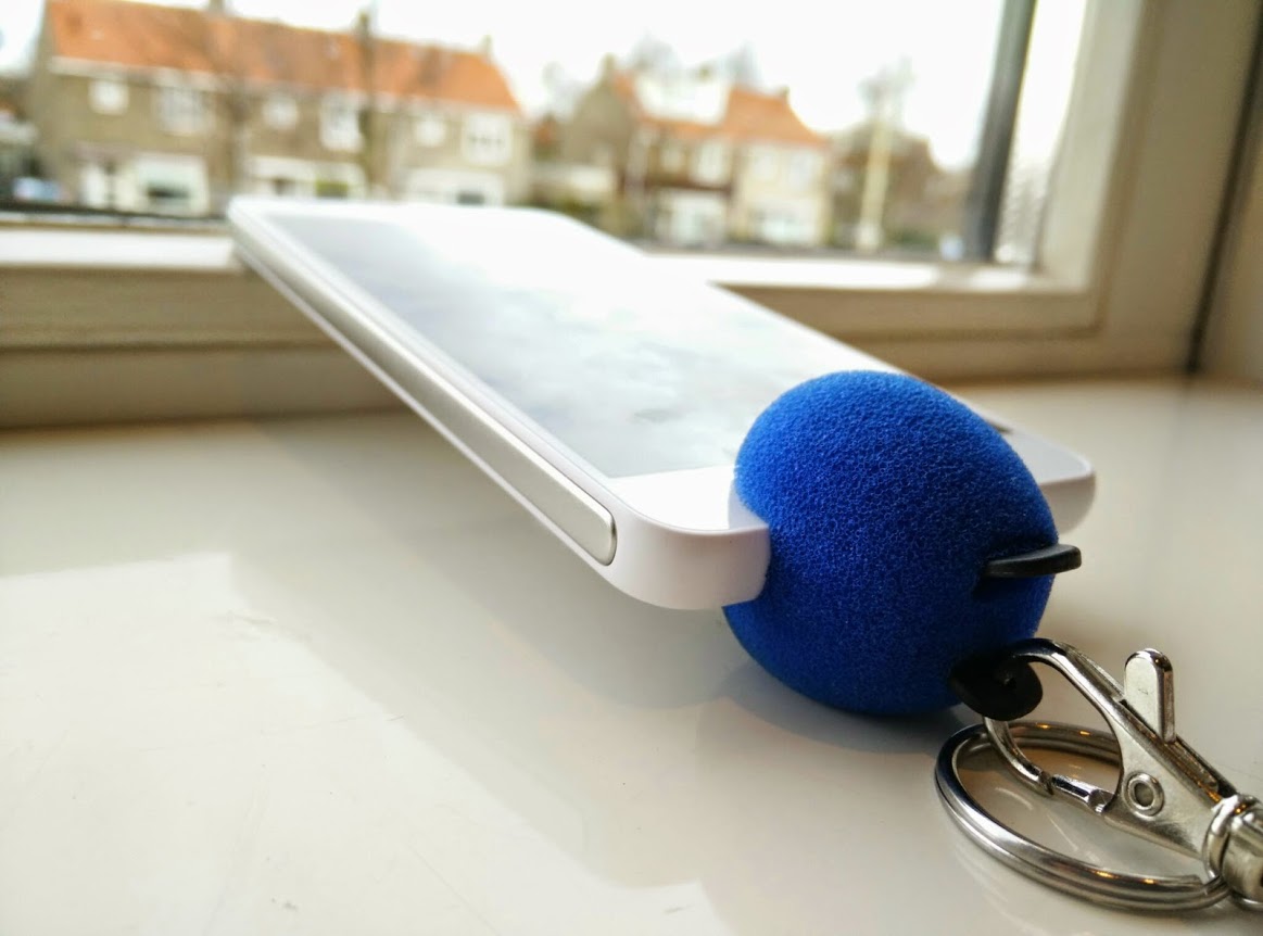 De Windblocker wordt geleverd in een plastic (al lijkt het glas) doosje, met in de onderzijde een korte handleiding. De Windblocker is zo groot als een pingpongballetje, weegt praktisch niets en is voorzien van een hangertje om hem zo aan je sleutelbos te kunnen bevestigen. Hij is verkrijgbaar in bijna alle kleuren van de regenboog, voor ieder wat wils dus. Via de clip is hij eenvoudig aan je telefoon te klemmen, tot een centimeter dikte gok ik zo.