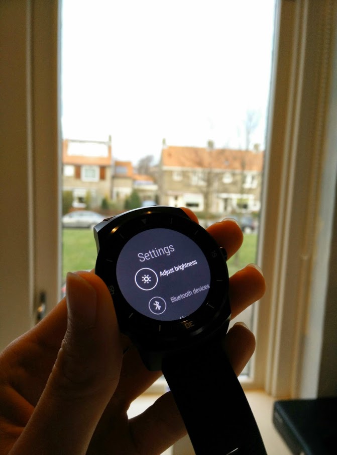 Het scherm meet 1,3″ en dat is naar mijn mening groot genoeg voor een smartwatch. Het OLED-paneel telt 320 bij 320 pixels, wat voor scherp beeld zorgt. OLED heeft als voordeel dat het geen achterliggend licht uitstraalt, waardoor zwart er mooi donker uitziet en de accu gespaard wordt in vergelijking met LCD-schermen. Het display zelf reageert goed op aanrakingen, al gaat het vegen soms wat lastig door de opstaande randen. Waar de concurrerende Motorola Moto 360 onderaan het scherm een zwart randje met sensoren heeft, is het LG gelukt om deze sensoren in de behuizing weg te werken, waardoor de G Watch R ’s werelds eerste volledig ronde horloge is. Dit verklaart overigens ook (deels) waarom de kast van de smartwatch wat forser is dan gebruikelijk.